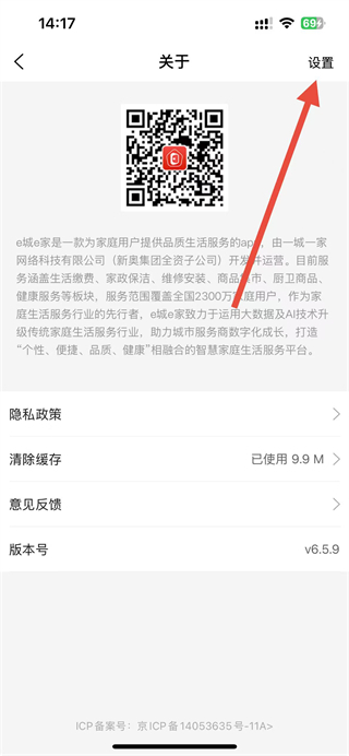 2、在關(guān)于界面,點(diǎn)擊右上角設(shè)置,可進(jìn)入設(shè)置頁面進(jìn)行相關(guān)操作。