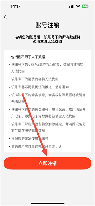 4、在賬號注銷界面,仔細(xì)閱讀說明后點(diǎn)擊立即注銷,即可完成e城e家賬號注銷。