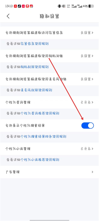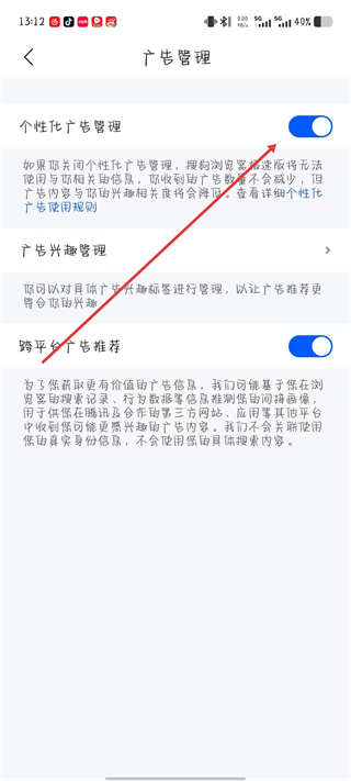 4、點擊個性化廣告管理右側(cè)的開關(guān)按鈕。