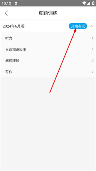 3、進(jìn)入真題訓(xùn)練頁面后,找到并點擊上方開始考試按鈕。