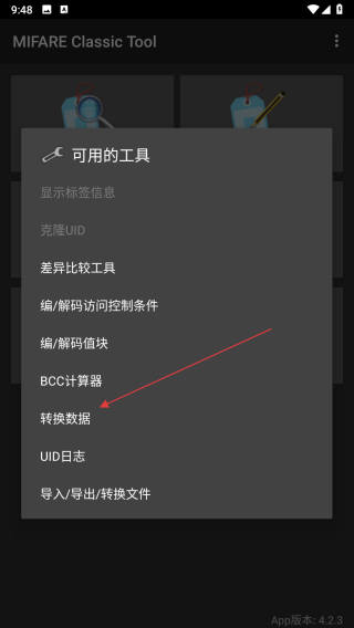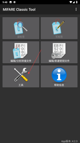 1、打開MIFARE Classic Tool應(yīng)用,在主界面點擊工具選項,彈出可用的工具菜單。