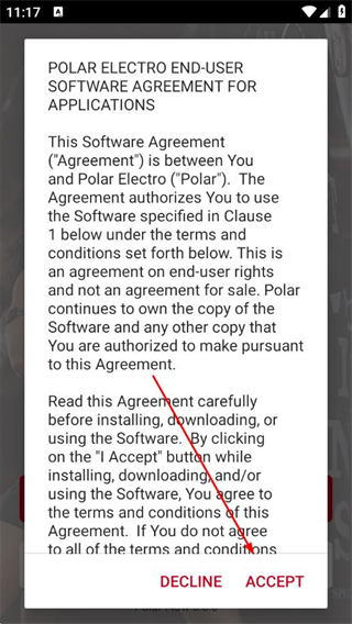 1、打開Polar Flow APP,在軟件協(xié)議頁面點擊ACCEPT。