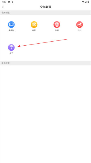 2、在全部頻道的頁面內(nèi),用戶需點(diǎn)擊下方綜藝的按鈕。