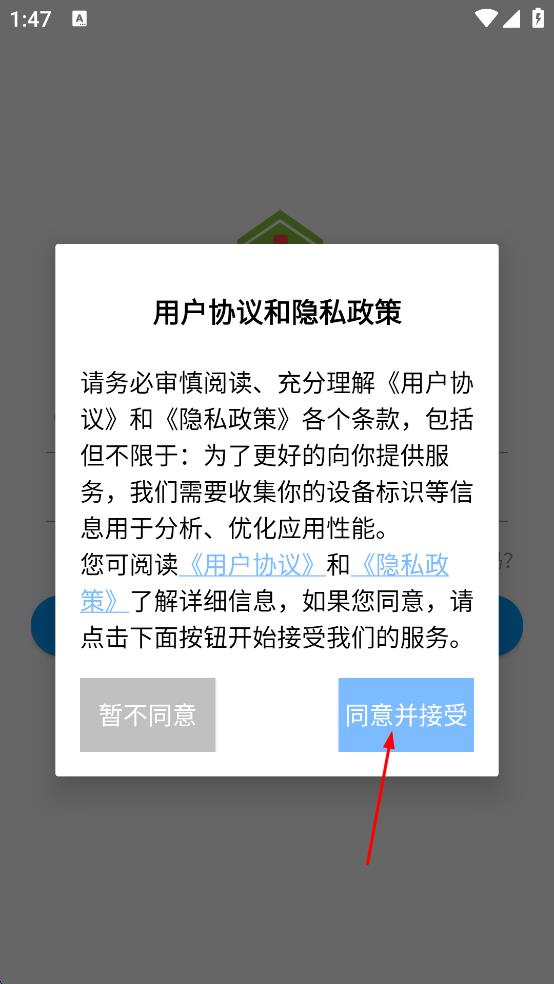 1、打開(kāi)醫(yī)療類(lèi)APP,會(huì)彈出用戶協(xié)議和隱私政策頁(yè)面,仔細(xì)閱讀后點(diǎn)擊同意并接受按鈕。
