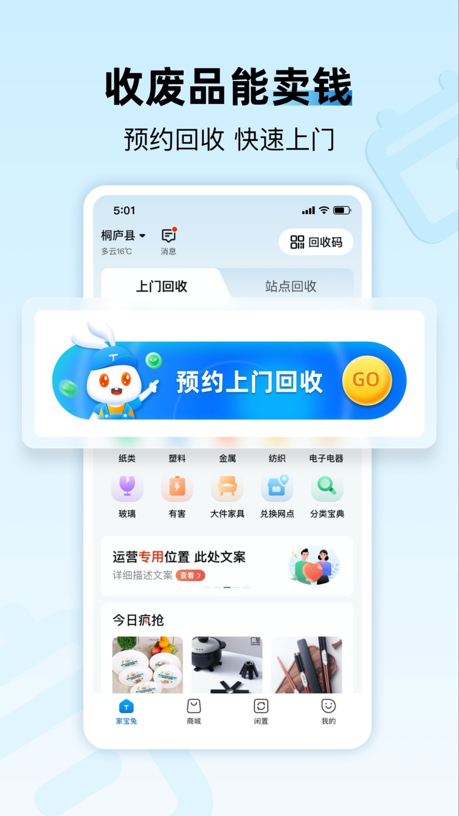 變廢為寶就在家寶,家寶兔app是一款方便居民回收廢品的互聯(lián)網(wǎng)+再生資源回收利用的軟件,每個用戶都能分配到他專屬的二維碼,依靠這個二維碼,用戶可以便捷的進行廢品回收、大件上門等,所獲得的積分還可以在商場中兌換價廉物美的商品。