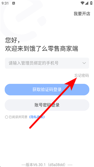 1、打開餓了么零售商家端APP,在登錄的界面點擊忘記密碼。