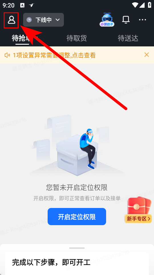 1、打開(kāi)蜂鳥(niǎo)眾包APP,點(diǎn)擊左上角的個(gè)人圖標(biāo),進(jìn)入個(gè)人頁(yè)面。