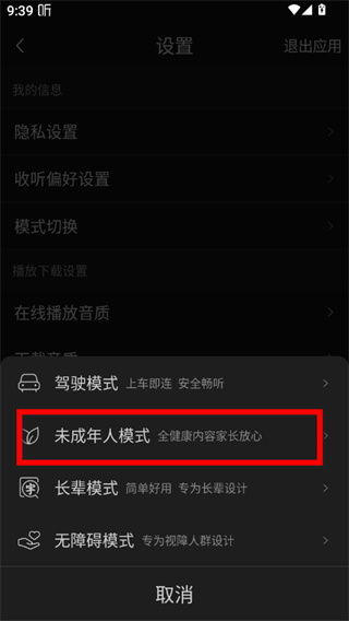 4、在模式選擇菜單中,點擊未成年人模式選項,即可開啟青少年模式。
