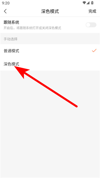 4、在深色模式設(shè)置界面,選擇深色模式選項(xiàng),點(diǎn)擊完成,即可開(kāi)啟深色模式。