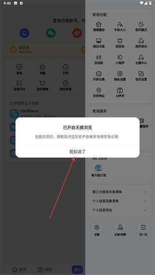 4、點(diǎn)擊后,會(huì)直接開啟無痕瀏覽,再次點(diǎn)擊我知道了即可。