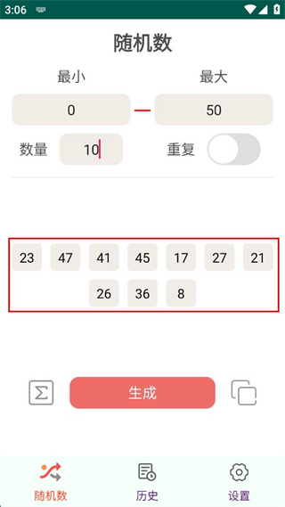 2、設(shè)置完成后,點(diǎn)擊紅色“生成”按鈕,生成隨機(jī)數(shù)。
