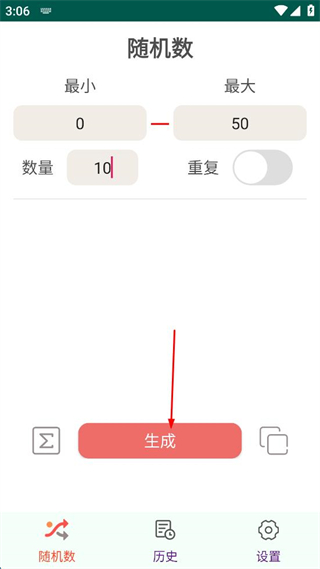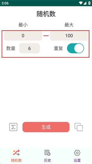 5、主界面快速設(shè)置最小最大值、所需隨機(jī)數(shù)數(shù)量以及是否允許重復(fù);