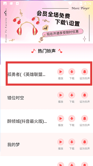 2、在鈴聲頁(yè)面,點(diǎn)擊熱門(mén)鈴聲中的鈴聲條目,可進(jìn)行播放、下載或設(shè)為鈴聲操作。