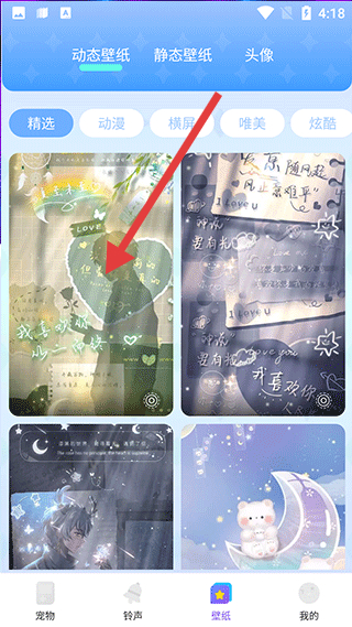 3、在壁紙頁(yè)面,點(diǎn)擊動(dòng)態(tài)壁紙或靜態(tài)壁紙分類(lèi)下的壁紙卡片,可查看壁紙?jiān)斍榛蛟O(shè)置為壁紙。