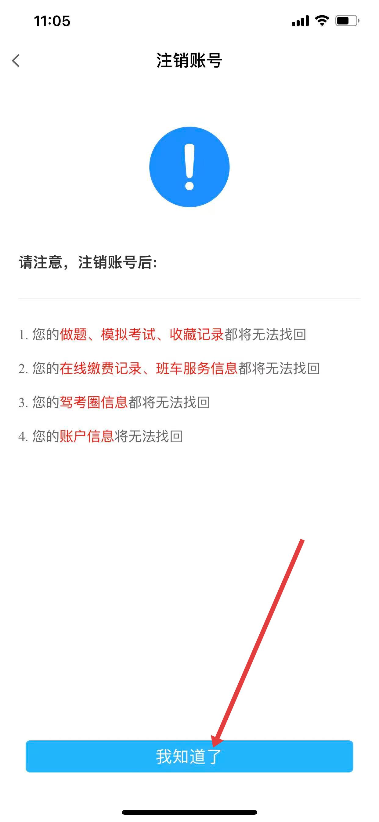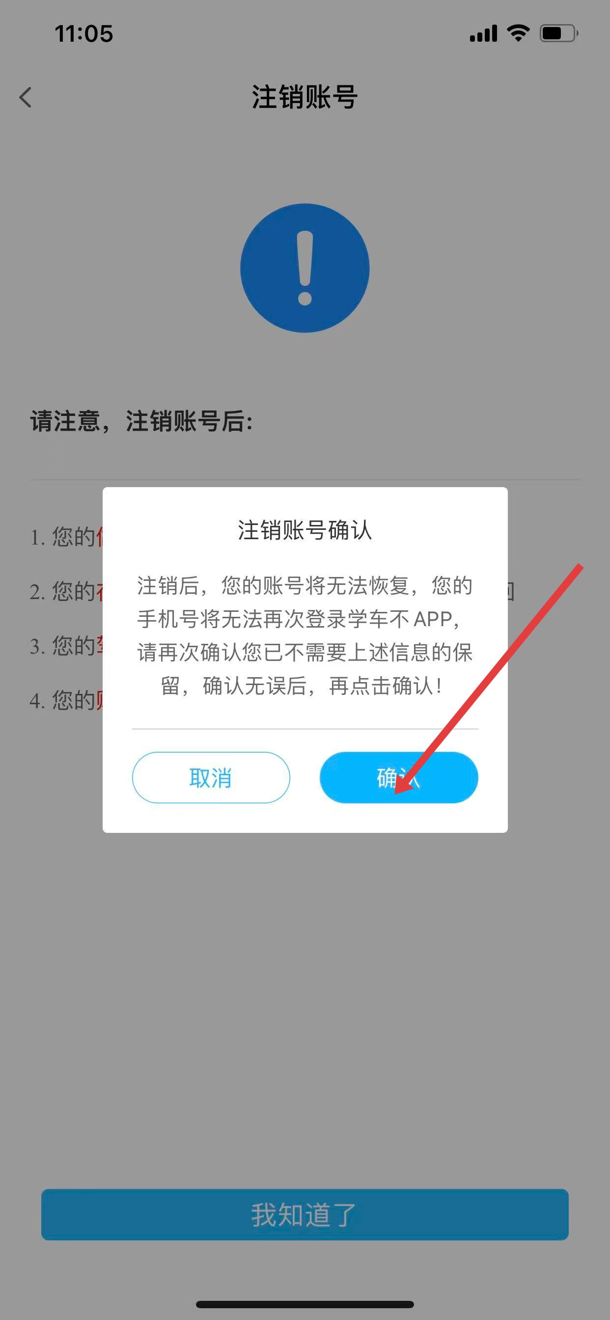 4、在彈出的注銷賬號提示頁面,閱讀相關(guān)提示信息后,點擊我知道了。
