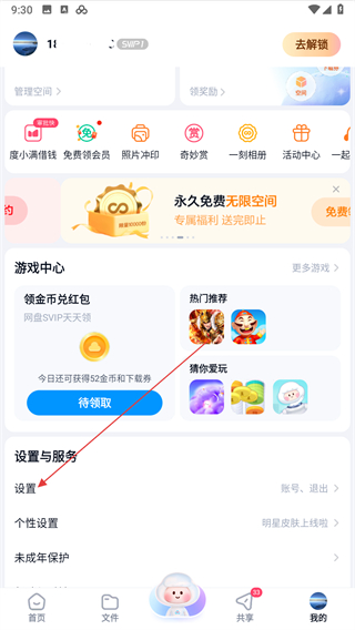1、打開百度網(wǎng)盤應(yīng)用,點(diǎn)擊底部導(dǎo)航欄中的我的選項(xiàng),進(jìn)入個(gè)人頁面,在設(shè)置與服務(wù)的板塊中找到設(shè)置,進(jìn)入設(shè)置界面。