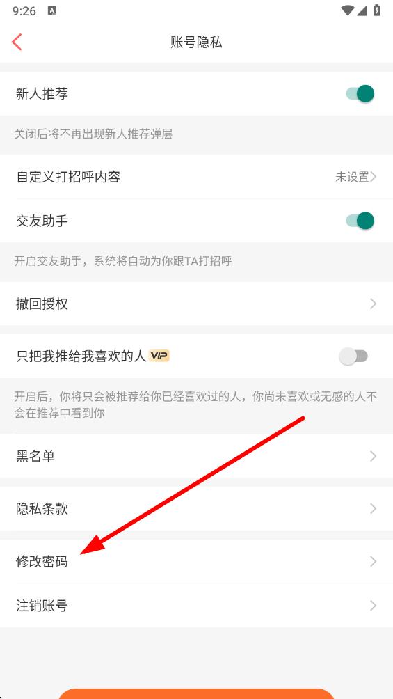 4、進(jìn)入賬號(hào)隱私頁(yè)面,點(diǎn)擊修改密碼的選項(xiàng)。