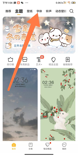 1、在小米主題首頁(yè),點(diǎn)擊字體選項(xiàng),進(jìn)入字體選擇頁(yè)面。