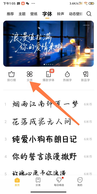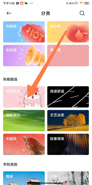 2、在字體頁(yè)面,點(diǎn)擊分類選項(xiàng),進(jìn)入字體分類界面。