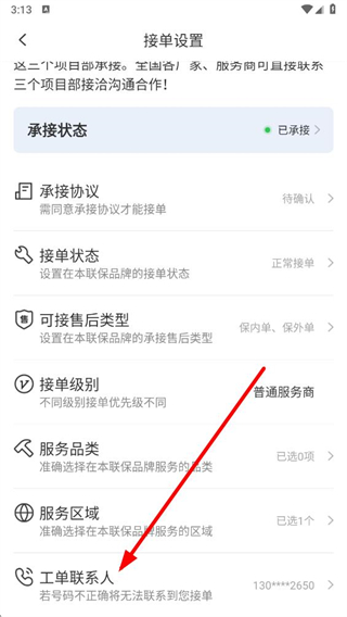 3、進(jìn)入接單設(shè)置頁面后,點(diǎn)擊工單聯(lián)系人選項(xiàng)。