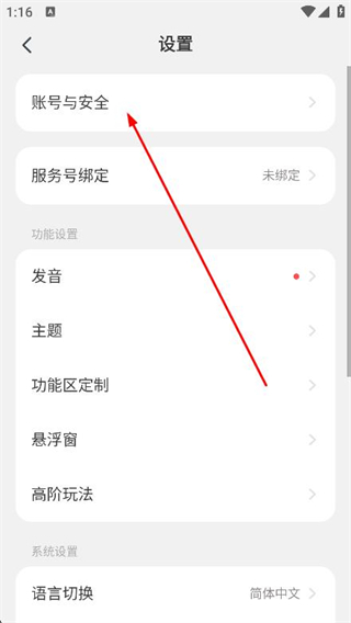 3、進(jìn)入設(shè)置頁面后,點(diǎn)擊上方賬號與安全選項(xiàng)。