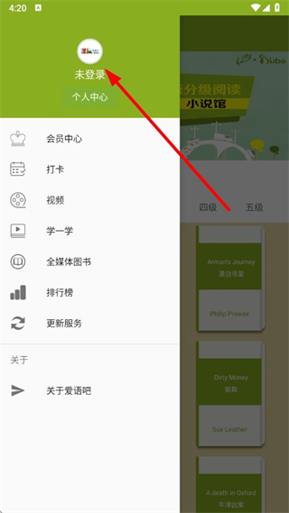 1、在劍橋英語小說館app首頁,點擊左上角菜單按鈕,展開側(cè)邊欄。