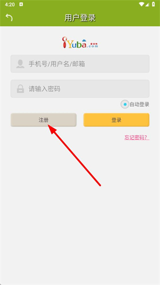 4、在用戶登錄界面,點擊注冊,進入用戶注冊界面。