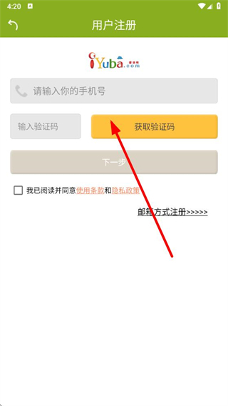 5、在界面輸入手機號,獲取驗證碼輸入,勾選同意使用條款后,點擊下一步按照提示完成注冊。