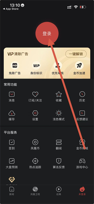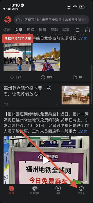 1、在鳳凰新聞首頁(yè),點(diǎn)擊右下角未登錄選項(xiàng),進(jìn)入個(gè)人功能頁(yè)面。