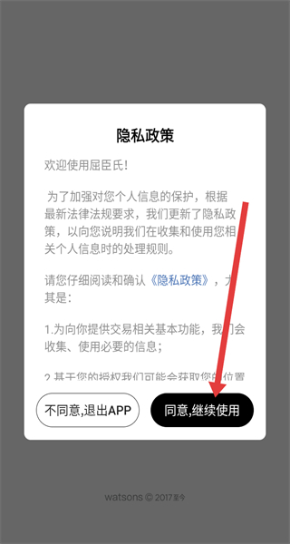 1、點(diǎn)擊“隱私政策”彈窗的“同意,繼續(xù)使用”,進(jìn)入屈臣氏APP首頁(yè)。