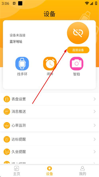 2、在設(shè)備頁面點(diǎn)擊連接設(shè)備按鈕,選擇找手環(huán)選項(xiàng)。