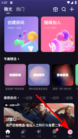 1.首先我們在本站下載安裝好微光APP后,登陸賬號進入軟件,可以看見頁面有1V1房、多人房,顧名思義1V1就是兩個人單獨一起看劇交流,多人就是兩人以上一起交流聊天;