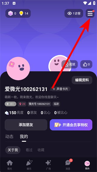 1.打開微光APP,點擊右上角的三條橫線圖標,展開功能菜單。