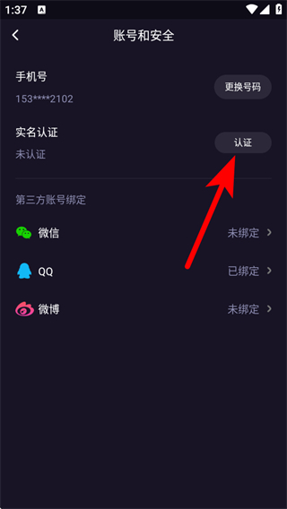5、進入賬號和安全頁面后點擊實名認證右側(cè)的認證按鈕,按提示完成認證。