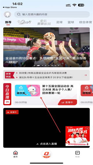 1、打開央視體育的APP,進(jìn)入首頁選擇并點擊要觀看的直播。