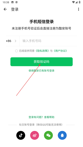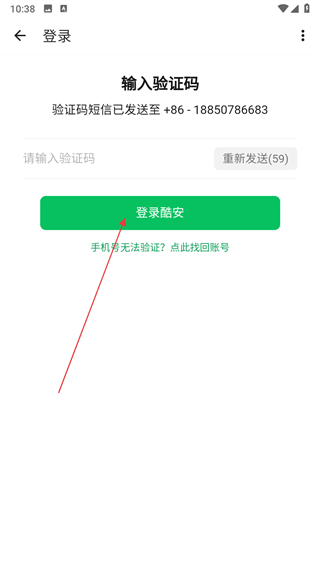 4、輸入收到的驗證碼,點擊登錄酷安,即可完成酷安手機號碼的登錄。