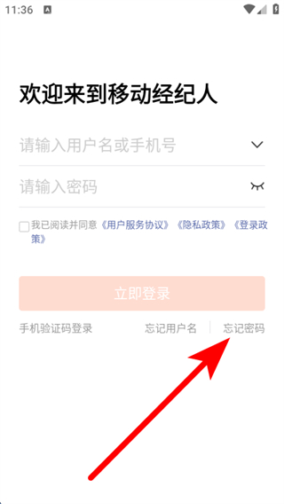 1、打開移動(dòng)經(jīng)紀(jì)人APP,在登錄界面點(diǎn)擊忘記密碼的選項(xiàng)。