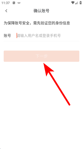 2、進(jìn)入確認(rèn)賬號(hào)頁(yè)面,輸入用戶名或登錄手機(jī)號(hào),點(diǎn)擊下一步。