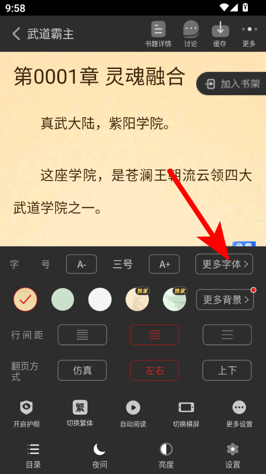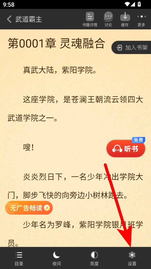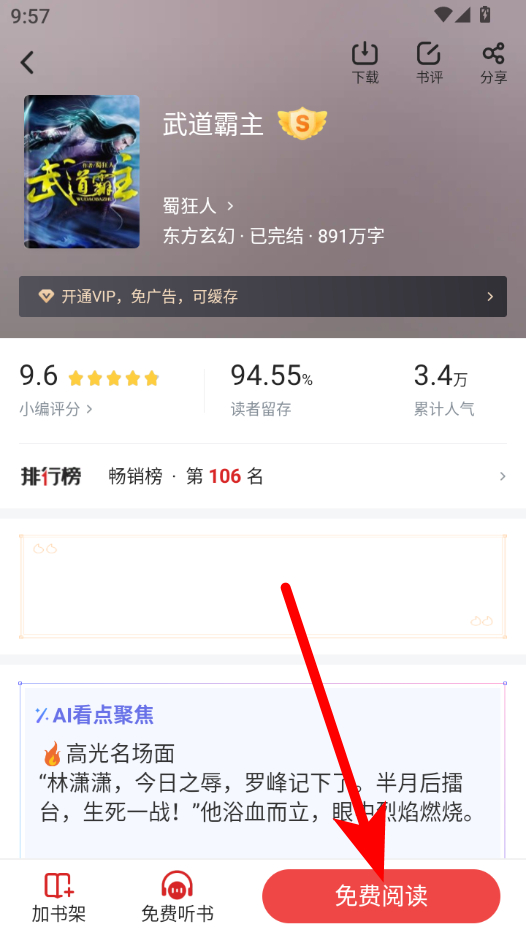 1、在追書神器小說詳情頁面,點(diǎn)擊免費(fèi)閱讀,進(jìn)入小說閱讀頁面。