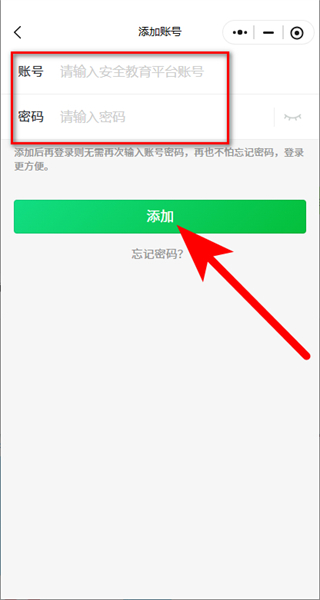 4、在添加賬號(hào)頁(yè)面,輸入安全教育平臺(tái)的賬號(hào)和密碼,點(diǎn)擊添加按鈕,即可添加另外一個(gè)賬號(hào)。