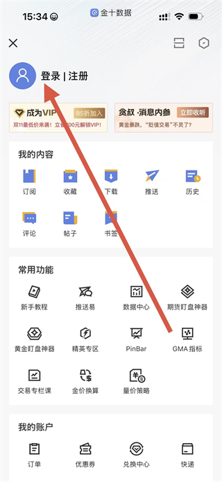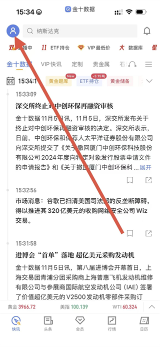 1、在金十?dāng)?shù)據(jù)快訊頁面,點(diǎn)擊左上角個(gè)人圖標(biāo),進(jìn)入個(gè)人界面。