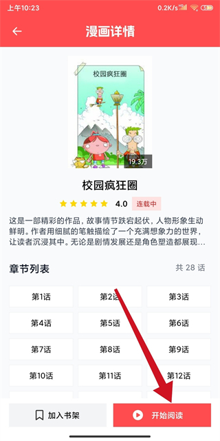 3、在漫畫詳情頁點(diǎn)擊開始閱讀,進(jìn)入漫畫閱讀頁面。