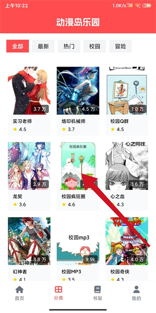 2、在分類頁面中,選擇喜歡的漫畫如校園瘋狂圈,進(jìn)入漫畫詳情頁。
