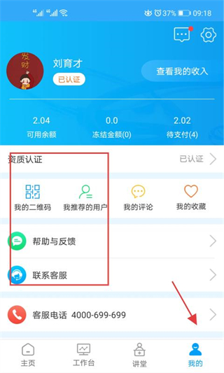 4、我的板塊可進行資質(zhì)認證、查看收入、管理二維碼、推薦用戶、查看評論和收藏,還有幫助與反饋、聯(lián)系客服等功能,方便進行賬號管理。