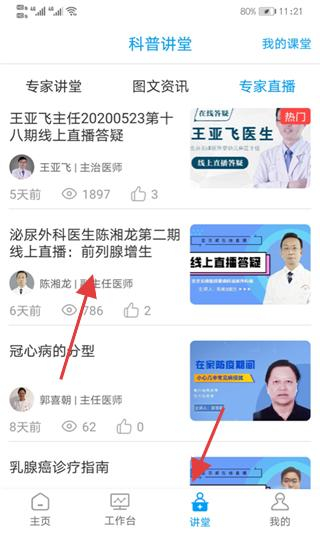 1、設有講堂板塊,包含專家講堂、圖文資訊、專家直播等內(nèi)容,醫(yī)生可學習醫(yī)學知識,如泌尿外科、冠心病、乳腺癌等領域的診療知識。