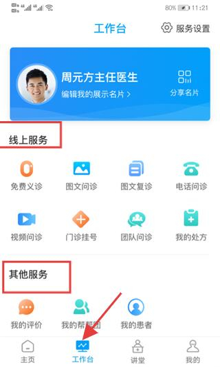2、在工作臺板塊提供豐富的線上服務,包括免費義診、圖文問診、圖文復診、電話問診、視頻問診、門診掛號、團隊問診及我的處方等。