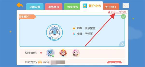 3、在賬戶中心頁面,點(diǎn)擊下方添加二寶檔案按鈕。