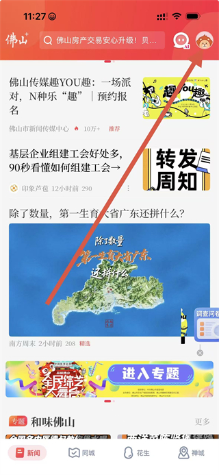 1、在佛山plus首頁(yè),點(diǎn)擊右上角頭像,進(jìn)入個(gè)人界面。
