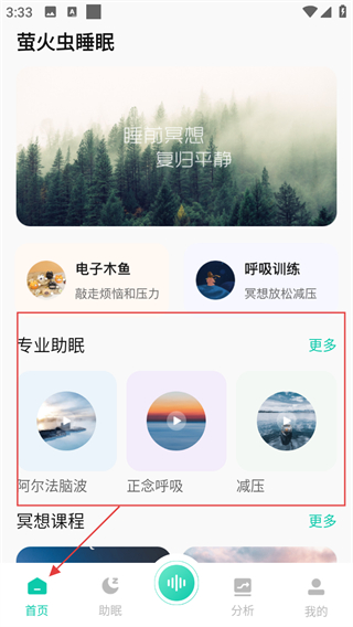 1、首頁提供電子木魚、呼吸訓(xùn)練、冥想課程等多種助眠和減壓功能,還有專業(yè)助眠音頻可供選擇。