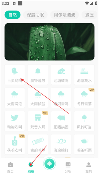 2、助眠頁面有自然、深度助眠、阿爾法腦波等多種分類的助眠音頻,如百靈鳥叫等,幫助用戶快速入睡。